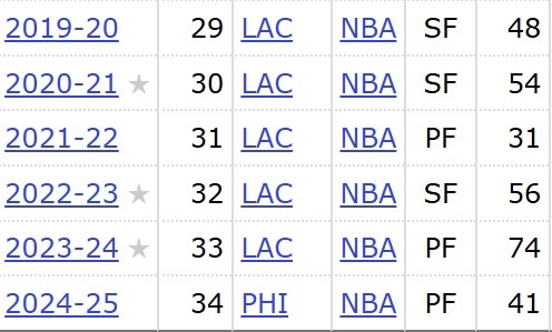 據統計,本賽季喬治出戰41場,是他自2021-22賽季以來出戰最少的一個賽季,近6年,他已經5次出戰不足60場,具體如下: