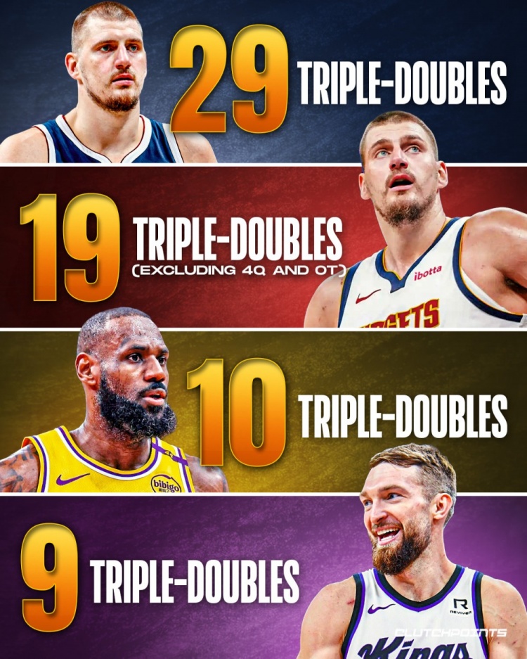 本賽季三雙榜:約基奇29次第一&只算前3節19次 詹姆斯10次第二