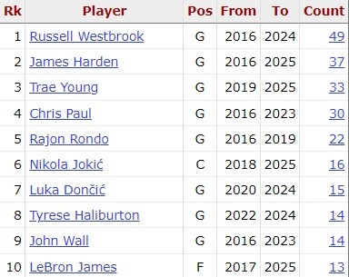 - 威少過去10個(gè)賽季50次半場助攻上雙 同期最多 哈登37次第二