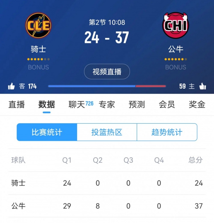 第二節(jié),公牛持續(xù)發(fā)力,2分鐘轟出8-0將優(yōu)勢(shì)擴(kuò)大到13分,打停騎士。