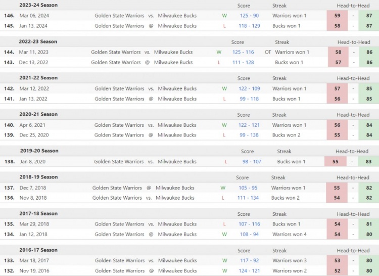 至此,勇士本賽季雙殺了雄鹿。而他們上一次在常規賽雙殺雄鹿,還要追溯到2016-17賽季。