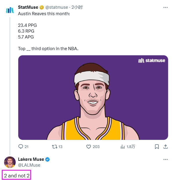 湖人媒體Lakers Muse評論道:“前二,但不是第二。”