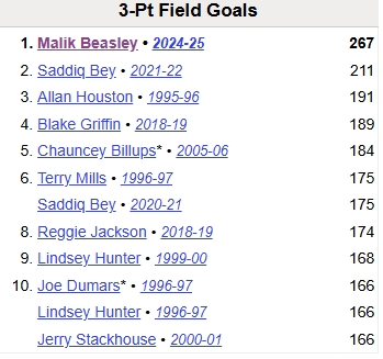 - 比斯利本賽季累計投進270記三分球 活塞隊史首位達成的球員