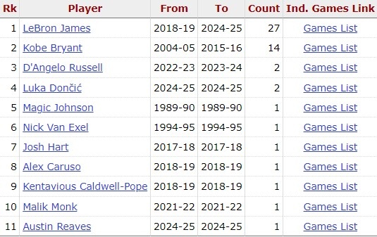 - 湖人隊史30+5+5+5三分場次:詹姆斯27 科比14 東契奇&拉塞爾2