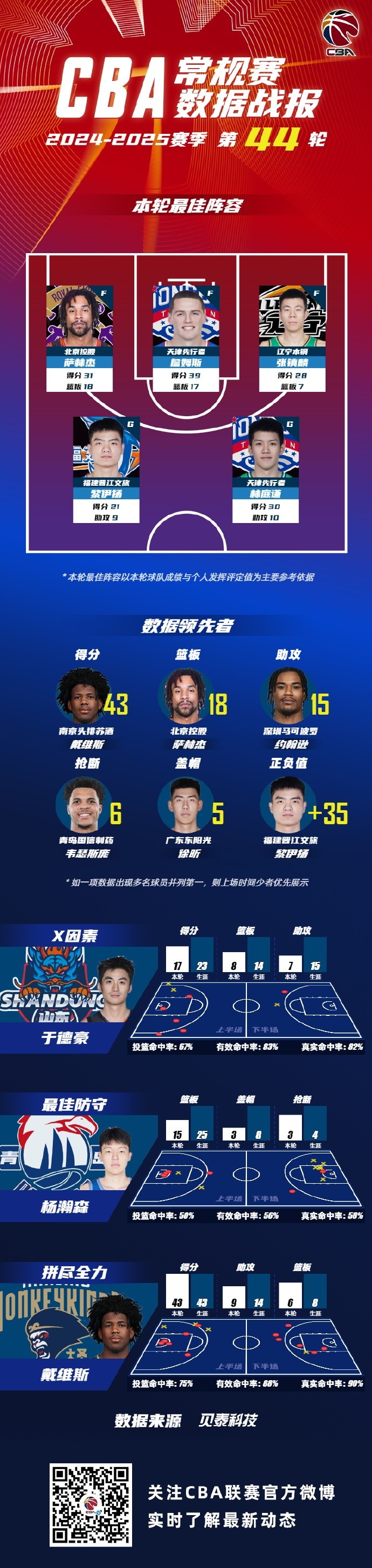 2024-2025賽季CBA聯賽常規賽第44輪結束較量,來自北京控股籃球俱樂部的薩林杰,天津榮鋼籃球俱樂部的詹姆斯和林庭謙 ,遼寧沈陽三生飛豹籃球俱樂部的張鎮麟和福建潯興SBS男籃的黎伊揚入選CBA聯賽常規賽第44輪最佳陣容!