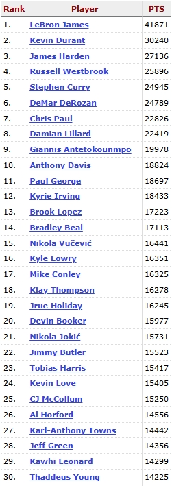 各位吧友們認為,誰將成為現役第10位20000分先生?現役得分Top30里,誰還有望達成該成就?
