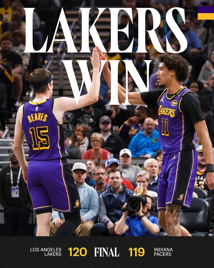 賽后湖人官方曬出贏球海報,里夫斯和海斯擊掌的畫面登上封面。