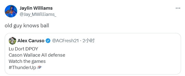 杰林-威廉姆斯對此也十分認同,他轉發了卡魯索的這條動態,并在旁邊寫道:“老將懂球。”