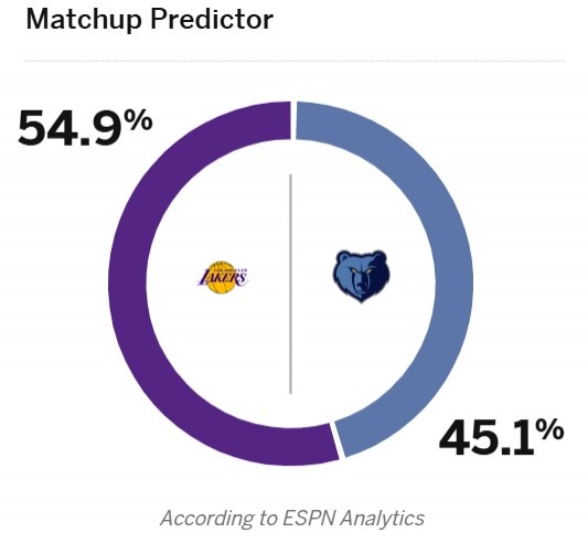 今天,ESPN預(yù)測(cè)本場(chǎng)比賽勝率,湖人54.9%,灰熊45.1%。