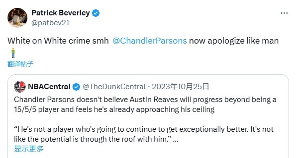 今天,貝弗利則打臉帕森斯,轉發了后者曾說“里夫斯15+5+5就已經到極限了”的言論,并寫道:“白人看不起白人,無語了,像個男人一樣出來道歉!”