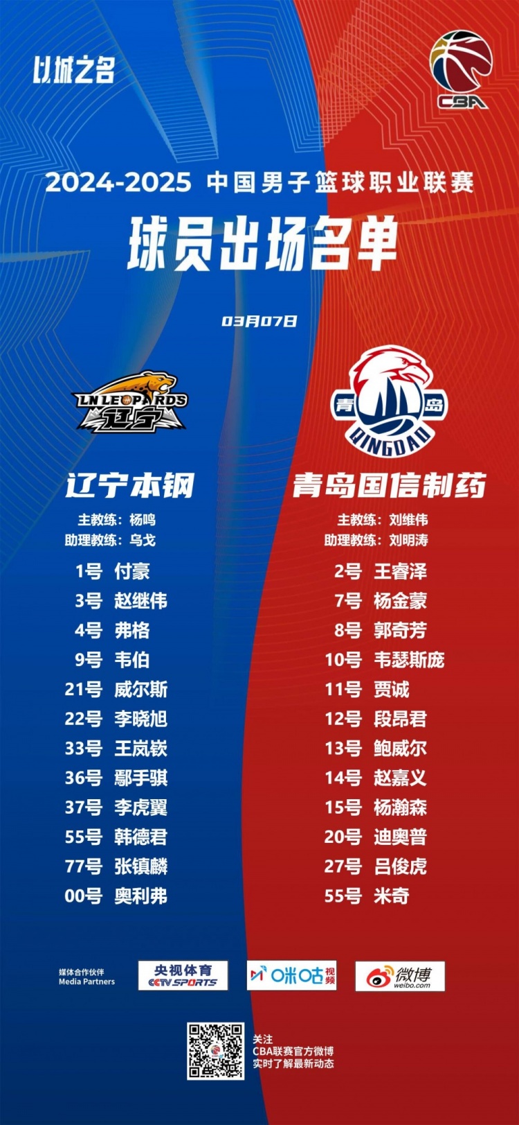 遼寧大名單:付豪、趙繼偉、弗格、韋伯、威爾斯、李曉旭、王嵐嵚、鄢手騏、李虎翼、韓德君、張鎮麟、奧利弗。