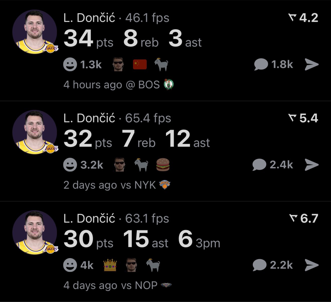 數(shù)據(jù)顯示,東契奇(26歲零9天)是2004年科比(25歲零218天)之后拿下三連30+最年輕的湖人球員。