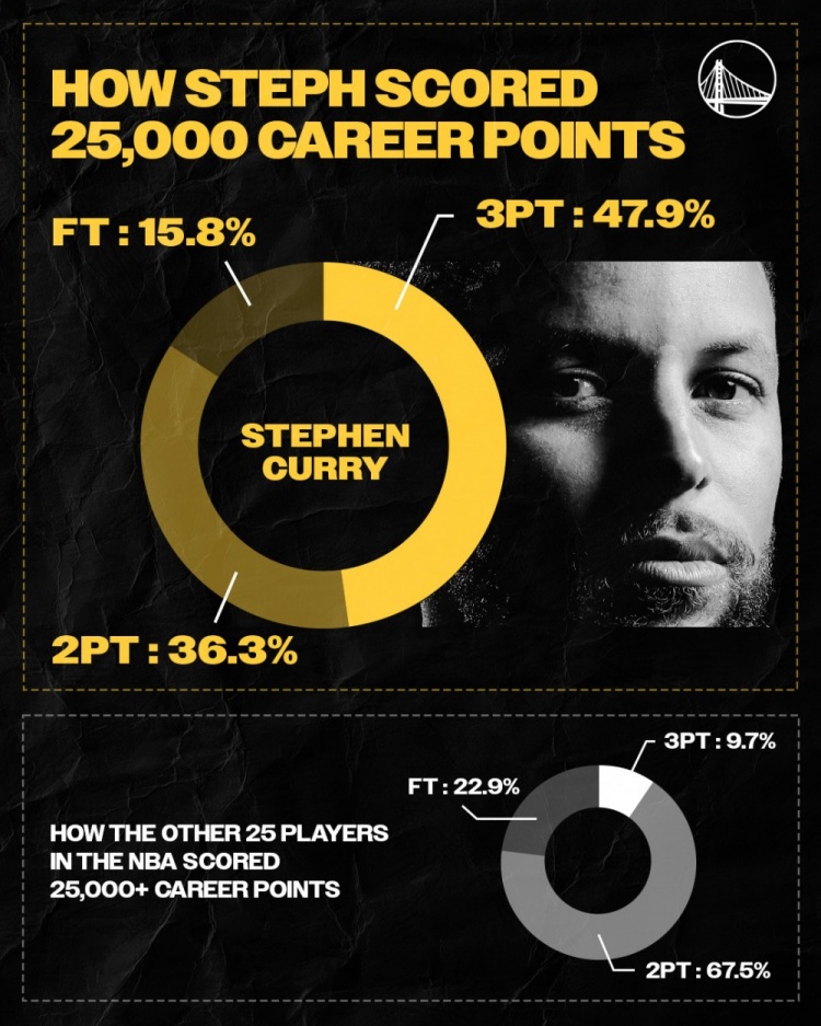 庫(kù)里25000分得分方式占比:兩分36.3%,三分47.9%,罰球15.8%;
