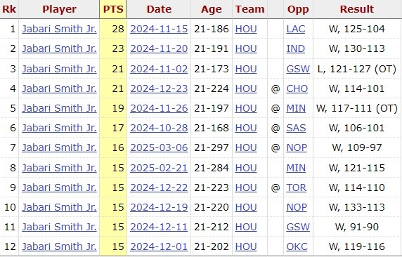 據統計,賈巴里-史密斯本賽季得分15+的比賽火箭12勝1負,只輸給勇士。