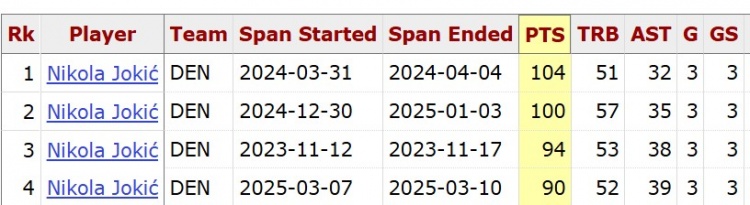 據統計,約基奇在連續3場比賽中至少得到90分50籃板30助攻,自聯盟合并以來唯一,而且他生涯已經是第4次做到這一點。