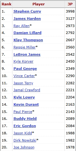 1. 詹姆斯-哈登(目前約2900+三分)(注:DeepSeek數據庫截止2023年底,實際數據為3127)