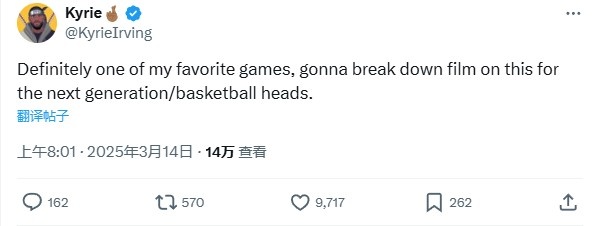 美媒寫道:“5年前的今天(2020年1月31日),歐文31分鐘砍下54分,僅投丟了4個球。”歐文則回復道:“這絕對是我最喜歡的比賽之一,我會為下一代(球員)/球迷們解析這場比賽。”
