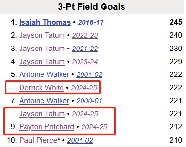 據統計,本賽季凱爾特人有3員大將有望沖擊隊史單賽季的三分命中數紀錄,算上今天的數據,分別為: