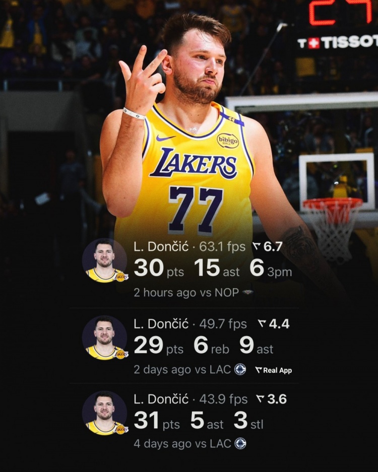 本場比賽,湖人球星東契奇19中9得到30分8籃板15助攻,其中三分球13中6。