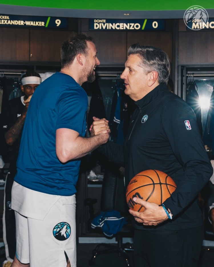 - 森林狼更衣室祝賀芬奇200勝:拿到比賽用球 華子戈貝爾裹浴巾合影