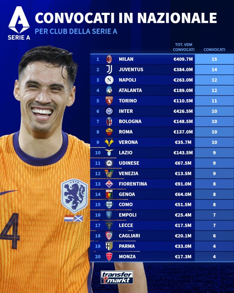 3月18日訊 德國轉會市場統計了意甲俱樂部被國家隊征召的球員人數,并列出榜單,米蘭15人最多,尤文14人次席。