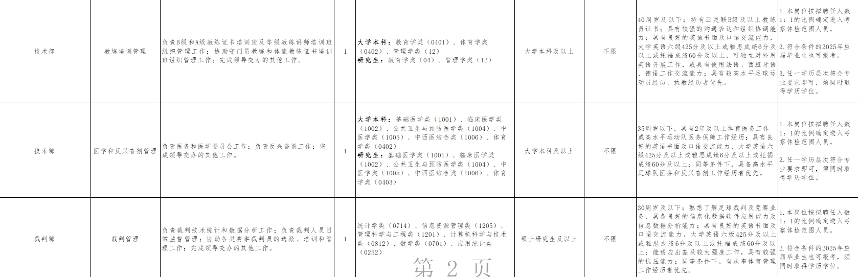 另外,綜合部(財務審核)、國家隊管理部(隊伍管理)、裁判部(裁判管理)、社會足球部(社會足球推廣)、媒體文化部(新聞宣傳)、數字信息部(數據分析)、紀檢監督部(紀檢監督)要求學歷為碩士研究生及以上,其余崗位為大學本科及以上。