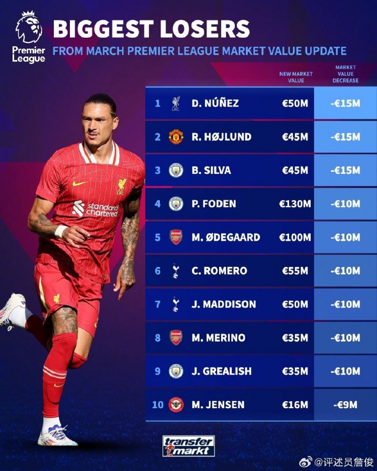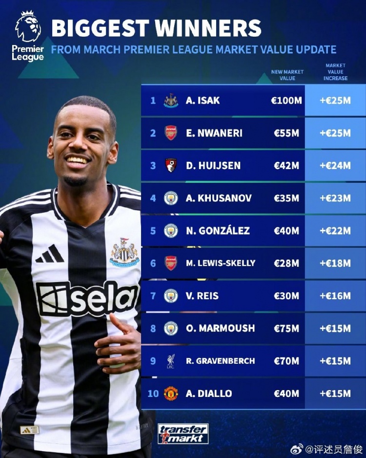 球員身價漲幅方面,伊薩克、恩瓦內利以2500萬歐的漲幅并列最多;跌幅方面,努涅斯、霍伊倫、B席均下跌1500萬歐并列最多,槍手中場梅里諾下跌1000萬歐,并列排第4位。