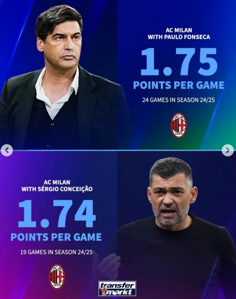 - 本賽季中途換帥6支球隊場均積分變化:曼聯提升0.36分,米蘭下降