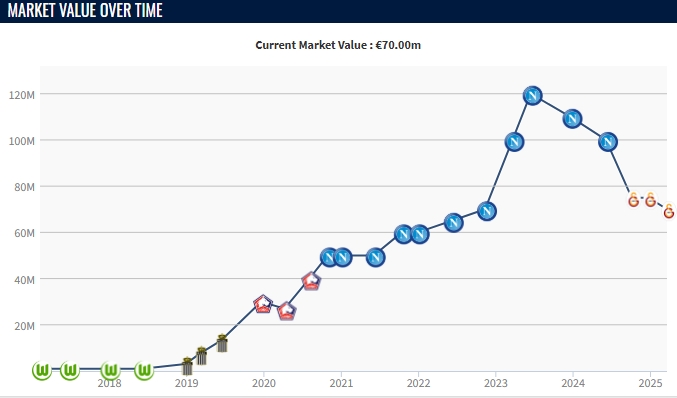 03月20日訊 德轉今日更新了土超球員身價,本賽季租借至加拉塔薩雷的奧斯梅恩身價再次下跌500萬歐,目前身價7000萬歐。