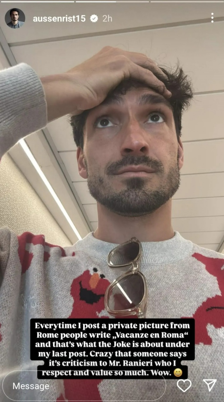 隨后,胡梅爾斯更新社媒進行澄清。他曬出自己表情無奈的自拍,并寫道:每當我發布在羅馬的私人照片時,人們都會寫‘羅馬假日’,這就是我上一篇帖子下面鬧出的笑話。 有人說那是對拉涅利先生的批評,這太瘋狂了,我非常敬重他。哇。????