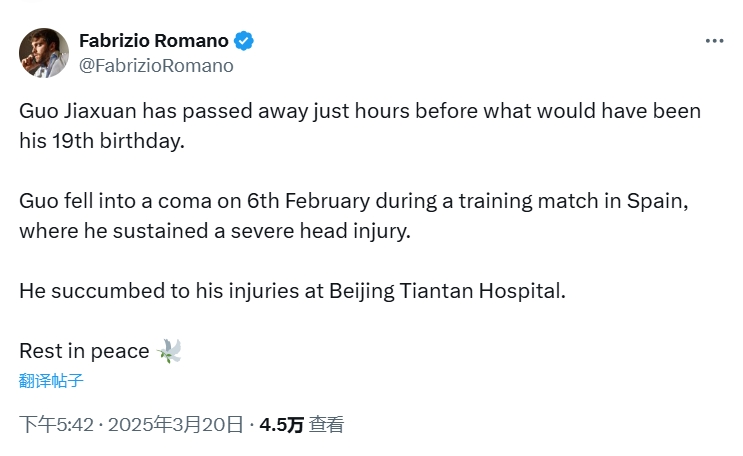 03月20日訊 18歲的國安青訓小將郭嘉璇昨日去世, 羅馬諾在社媒發文表示哀悼。