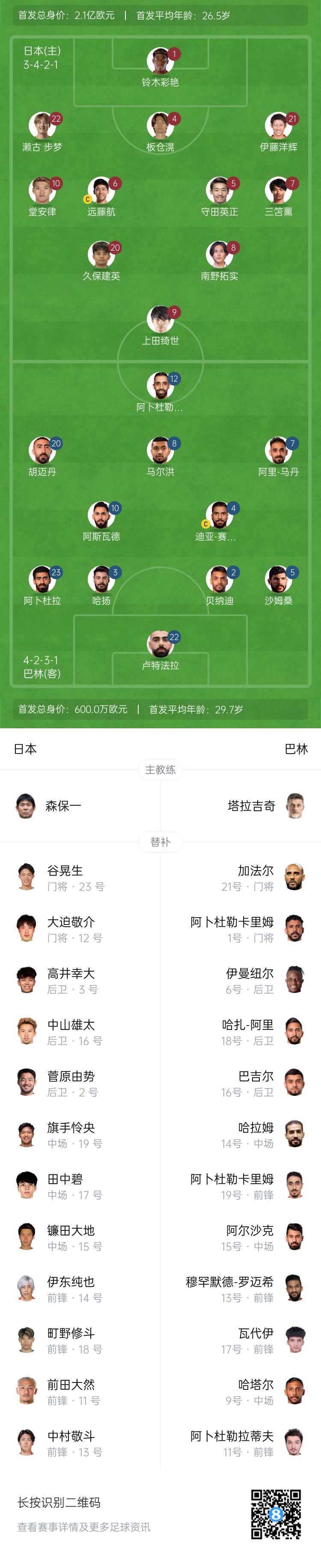 03月20日訊 北京時間18點35分,世預賽亞洲區第三階段C組第7輪,日本vs巴林,賽前雙方首發公布!本場比賽日本隊贏球即可提前晉級2026世界杯。
