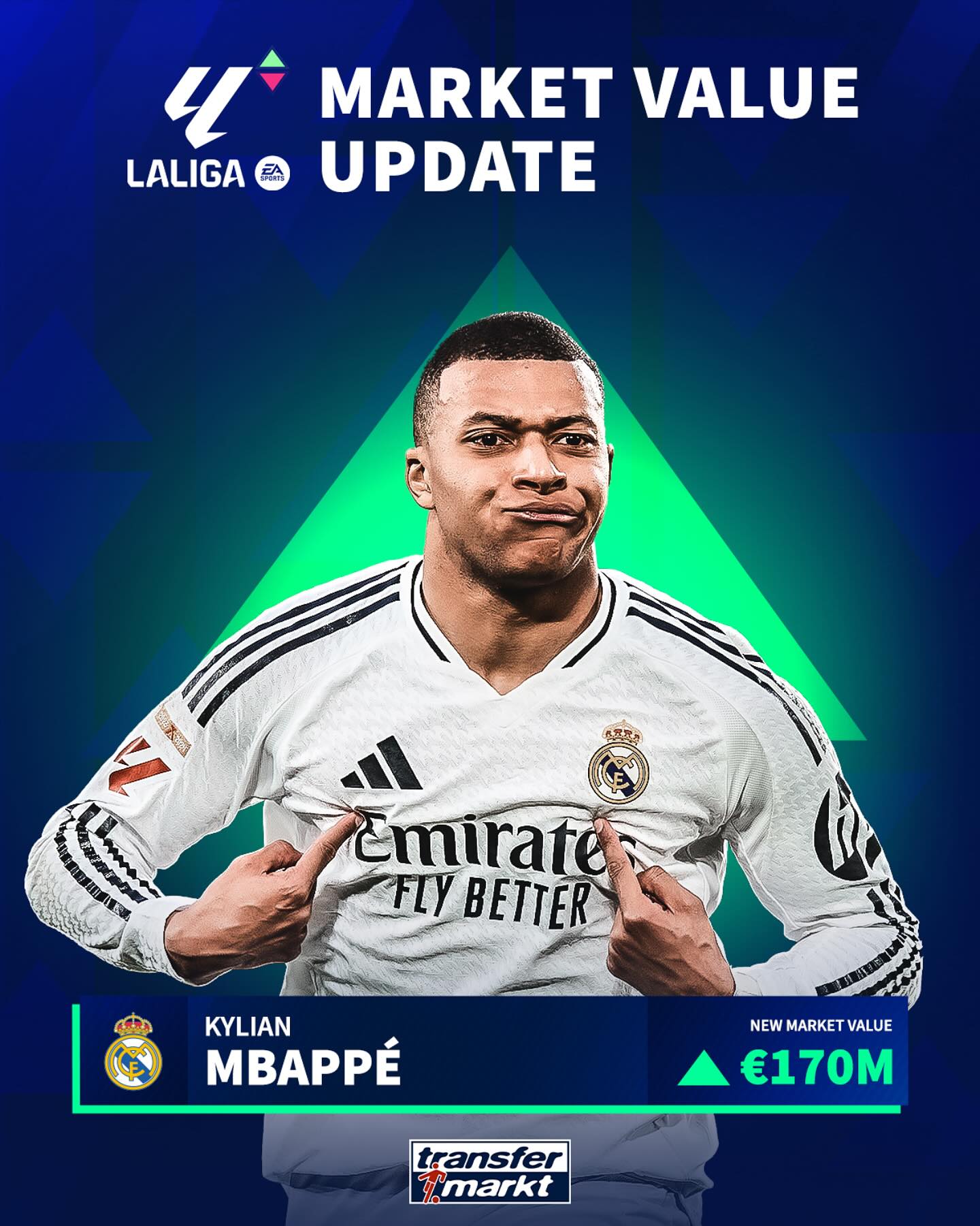 03月21日訊 今日德國(guó)轉(zhuǎn)會(huì)市場(chǎng)更新了西甲球員身價(jià),姆巴佩上漲1000萬歐至1.7億歐。