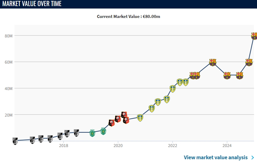 本賽季28歲的拉菲尼亞狀態優異,各賽事42場比賽打進27球,并有20次助攻,場均制造一球的同時也幫助巴薩多線爭冠,創造生涯最佳表現的他身價卻與去年12月份相同,仍為8000萬歐元。
