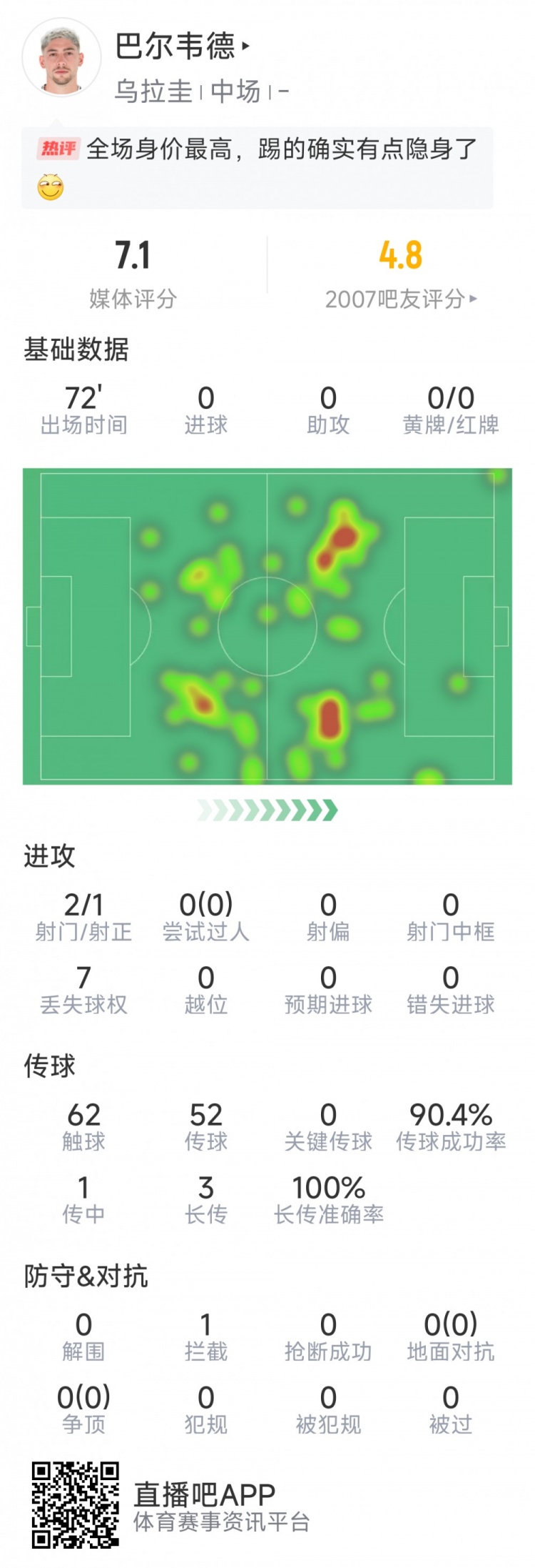 - 存在感不強(qiáng),巴爾韋德本場(chǎng)數(shù)據(jù):2射1正,對(duì)抗&搶斷等數(shù)據(jù)掛零