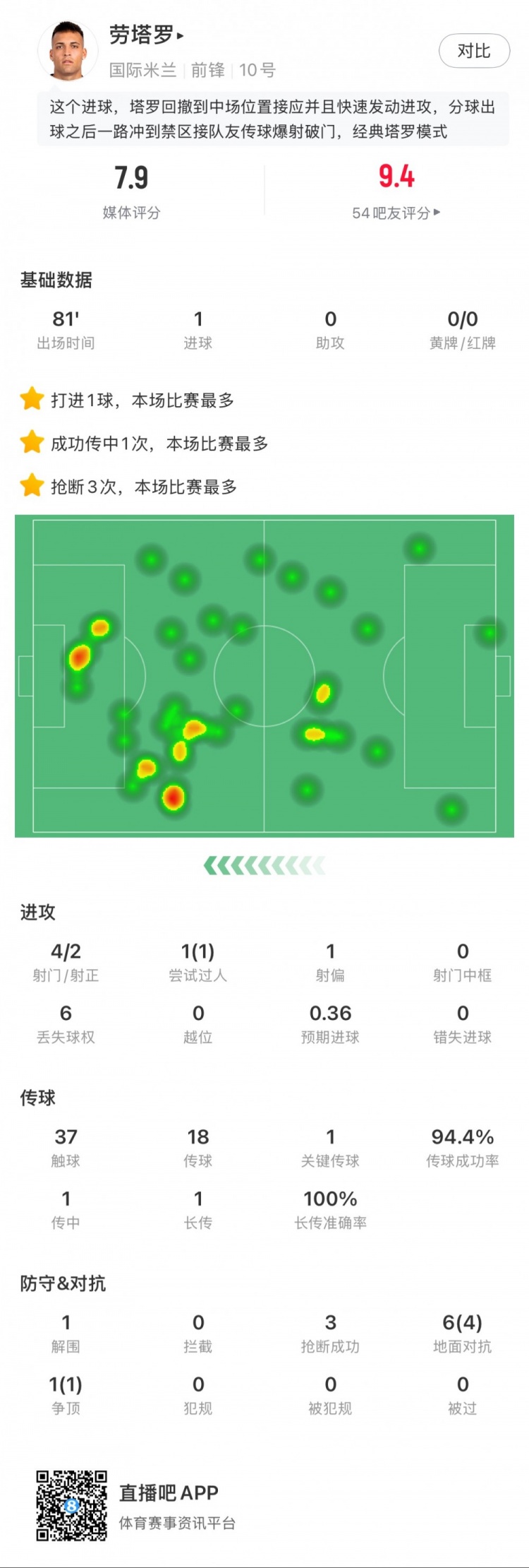 3月6日訊 歐冠1/8決賽首回合,國米客場2-0費耶諾德,勞塔羅本場數(shù)據(jù):
