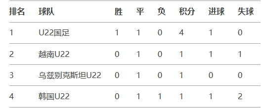 - U22邀請賽積分榜:U22國足1勝1平0失球暫居第一,末輪對陣越南