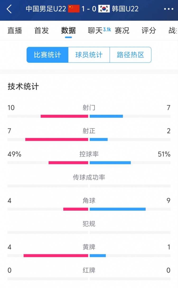 - U22國(guó)足1-0韓國(guó)全場(chǎng)數(shù)據(jù):控球率49%落后韓國(guó),10射7正領(lǐng)先對(duì)手