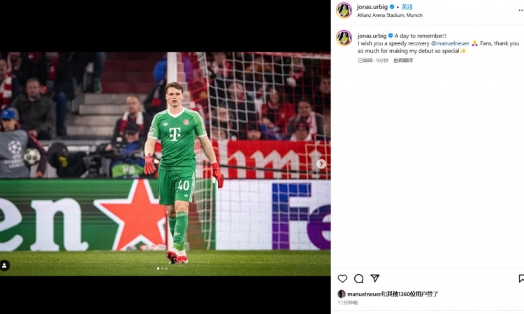 烏爾比希:“值得銘記的一天!我希望諾伊爾早日康復,感謝球迷們讓我的首秀如此特別。”