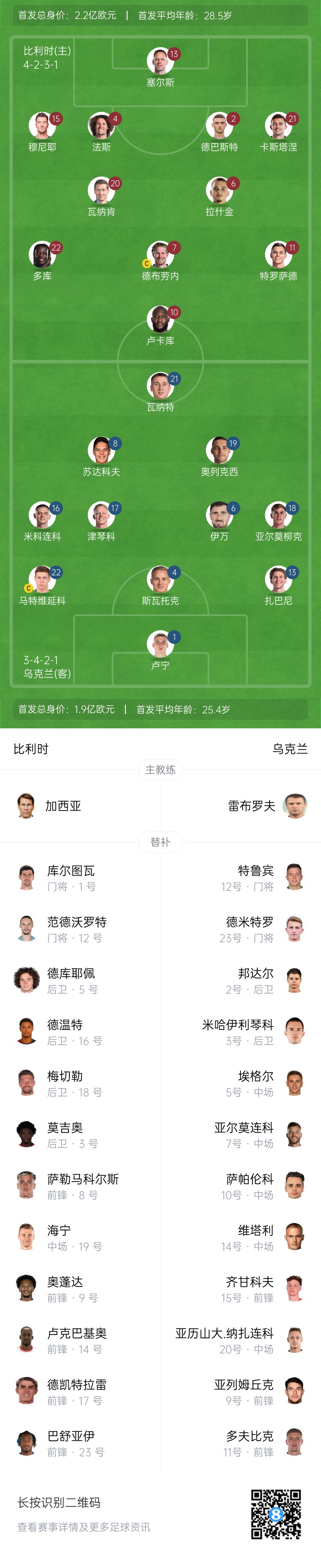 - 歐國聯-比利時vs烏克蘭首發:盧卡庫、德布勞內先發,多庫出戰