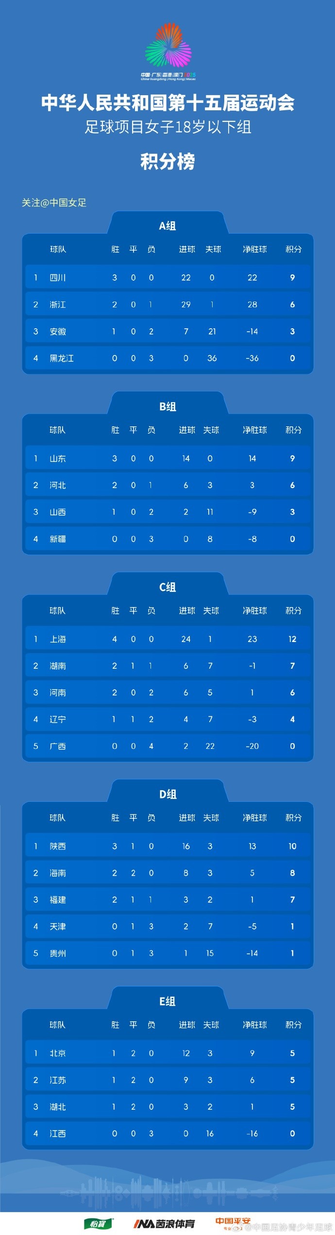 - 全運會女足U18資格賽(CD組)第5輪、(ABE組)第3輪賽果+積分榜