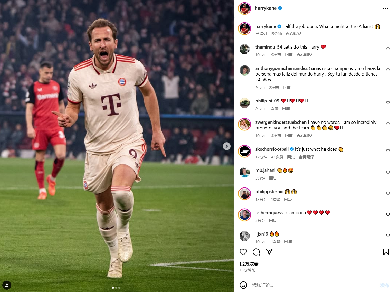 本場比賽凱恩梅開二度,賽后他也在個人社媒曬出本場慶祝照片,配文寫道:“完成一半的工作,安聯(lián)球場的美妙之夜!”
