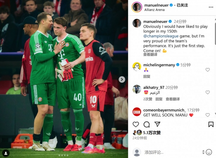 本場比賽是諾伊爾生涯第150次歐冠出場,不過他在比賽中因傷被換下。賽后他在個人社媒曬出被烏爾比希換下照片,配文道:“顯然我希望在自己第150場歐冠踢更長時間,但是我為球隊的表現感到驕傲,這只是晉級的第一步,加油!”