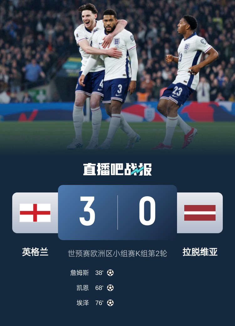 里斯-詹姆斯精彩任意球破門,賴斯助攻凱恩破門,埃澤單兵爆破建功。最終,英格蘭3-0戰勝拉脫維亞,世預賽2連勝暫3分領跑K組。