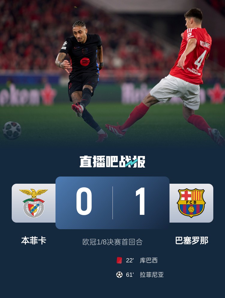 歐冠1/8決賽首回合,十人巴薩客場1-0本菲卡,庫巴西直紅,拉菲尼亞進球。