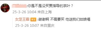 有網(wǎng)友在評論里留言提問“你是不是沒買賈指導(dǎo)的茶葉?”對此王霜回復(fù)寫道:“謝謝啊,不需要買,他送我們姑娘喝。”