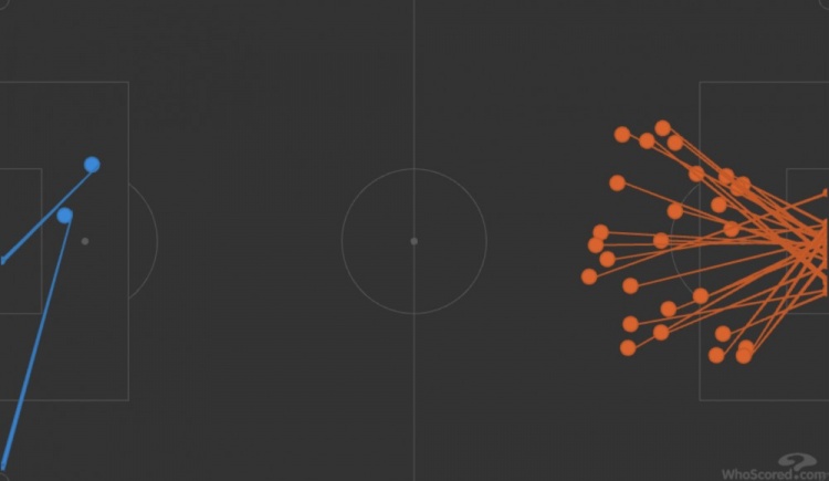 在whoscored統(tǒng)計(jì)的射門圖上,利物浦唯一的射正就進(jìn)球了,另一腳頂向了角旗;巴黎的射門則是密密麻麻……