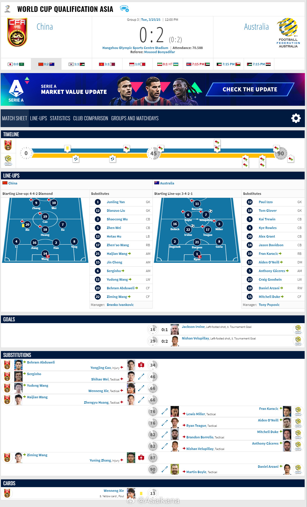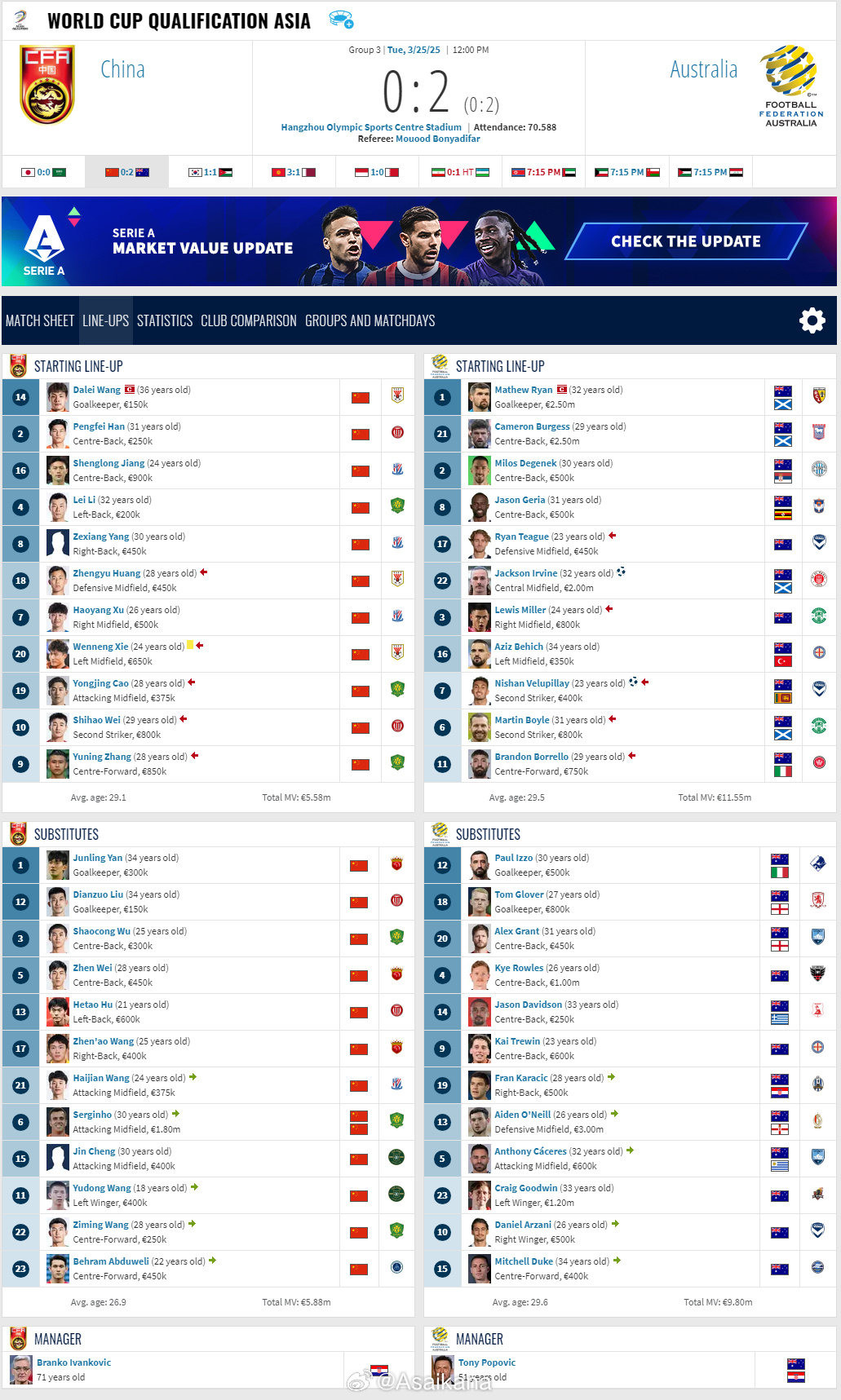 發布時間:2025年03月26日 12:04點擊:欄目:足球新聞 2026年美加墨世界杯亞洲區預選賽,中國0-2澳大利亞比賽報告 ???。 本文標簽: 足球 中超 中國足球 中國男足 相關閱讀: 2026年世界杯亞洲區預選賽,中國0-2澳大利亞比賽報告 ??? 羅馬官方:迪巴拉成功接受手術,接下來將展開復健 記者:拜仁有意沃爾特馬德、布爾卡特,球隊在考慮出售特爾 意媒:國米目標免簽若納坦-塔,請求橡樹資本破例 塞鳥發文慶祝國足首秀:7萬人的現場太震撼了 中國隊有最好的球迷 羅德里戈戰阿根廷賽前社媒:讓我們與上帝同行 意媒:拉齊奧咨詢基耶薩,利物浦愿外租+1500萬歐選擇買斷 記者:埃切維里下賽季可能被外租至赫羅納,以適應歐洲足球 阿莫魯索:圖多爾將激活弗拉霍維奇 尤文紙面實力仍未兌現 意媒:迪馬爾科恢復合練 達米安&德弗里&扎萊夫斯基繼續單獨訓練