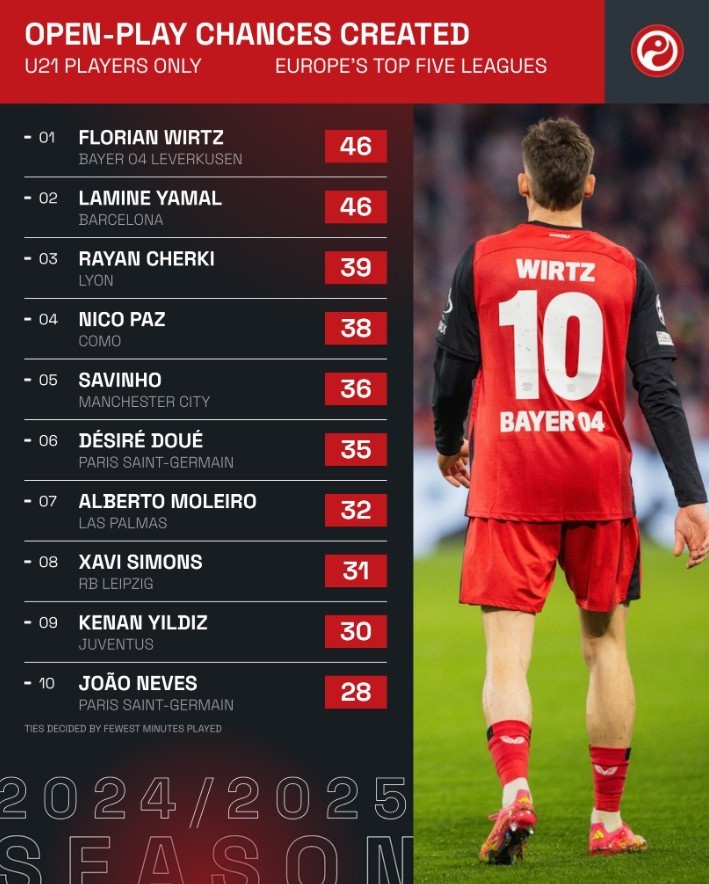 3月27日訊 《Squawka》統計出了本賽季創造重大機會最多的五大聯賽U21球員top10,亞馬爾以20次居首,至于運動戰創造機會方面,維爾茨和亞馬爾則以46次并列榜首。