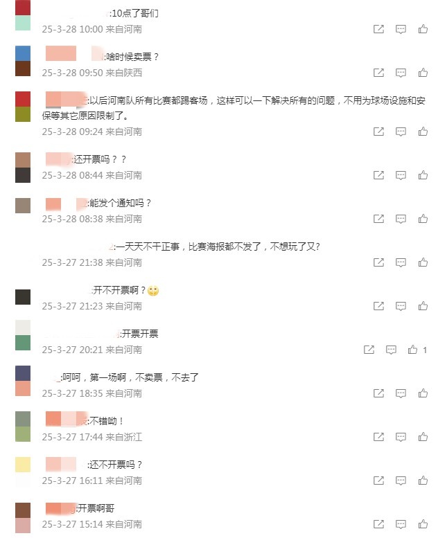 根據賽程安排,河南隊將在本輪聯賽主場對陣上海申花,比賽時間為3月29日(星期六)18:00。在賽前僅剩一天的時候,俱樂部仍未售票,也沒有相關公告,這讓球迷等得非常急迫。在河南隊官方微博的評論區,球迷們在持續催促售票。